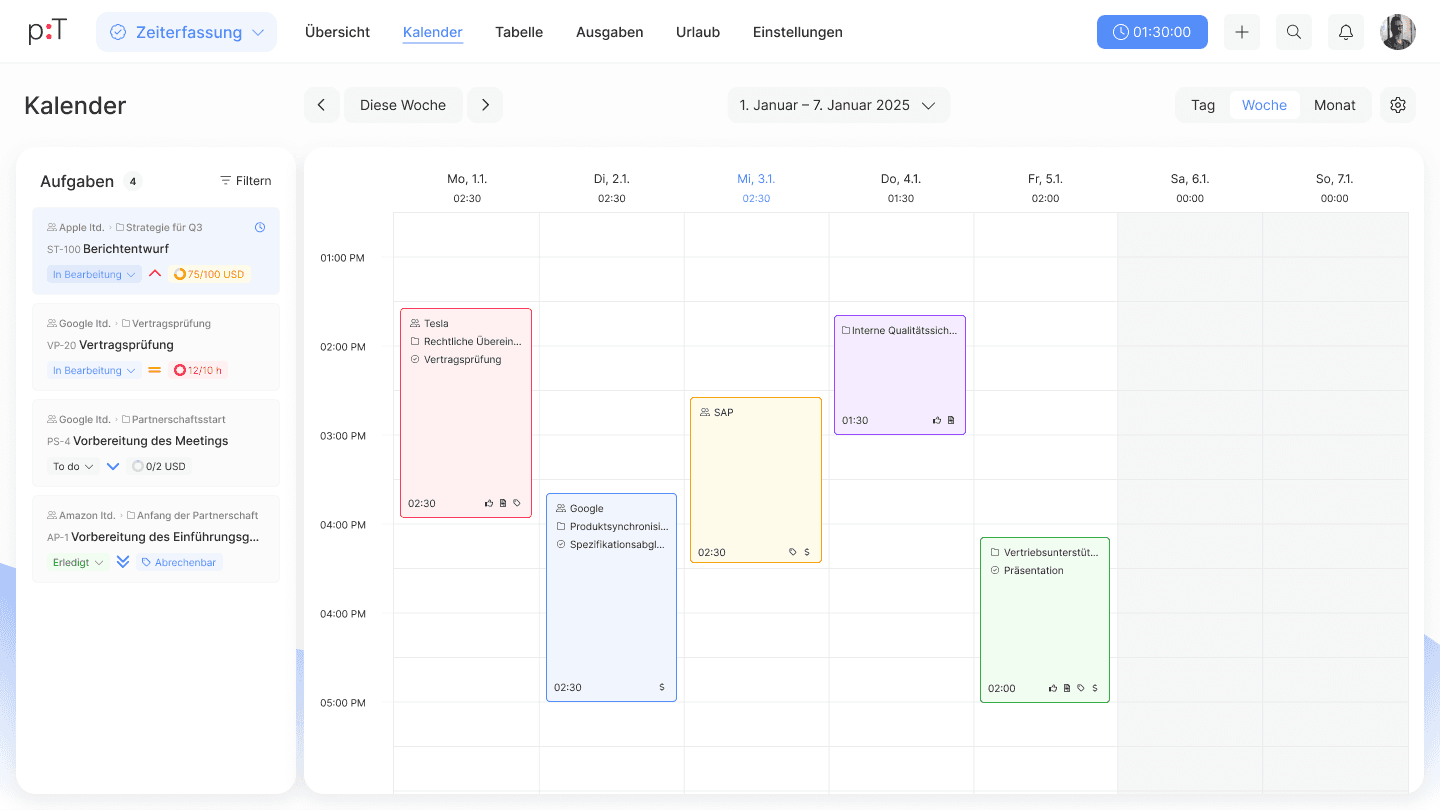 Behalten Sie im Blick, wie viel Zeit Sie womit verbringen. Nutzen Sie Timer, erfassen Sie Aufgaben, verwalten Sie Ihren Kalender – alles übersichtlich an einem Ort.t zugänglich.